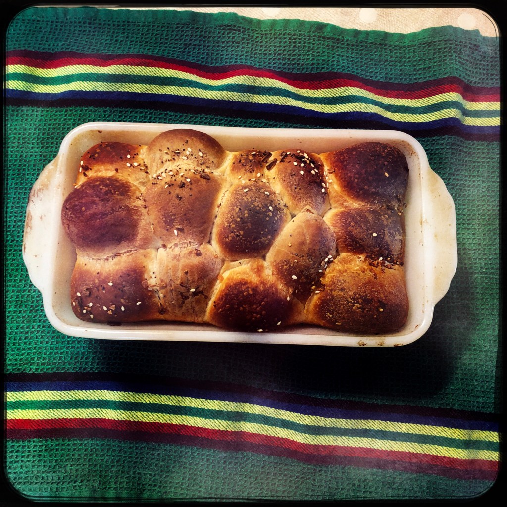 You can also make loaves of challah with the dough. When I want to do this, I cut a small opening in a bag of rolls and leave it out on the counter in the morning. By the time I’m home from work, I’ve got a nice bag full of dough to work with. (If you don’t remember to cut an opening in the bag, there’s a good chance it will explode all over your counter, so try not to skip that step.) I do find that this dough is not as sturdy as my own challah dough, so I have to be gentle when I braid it and make sure I allow enough time for a second rise.