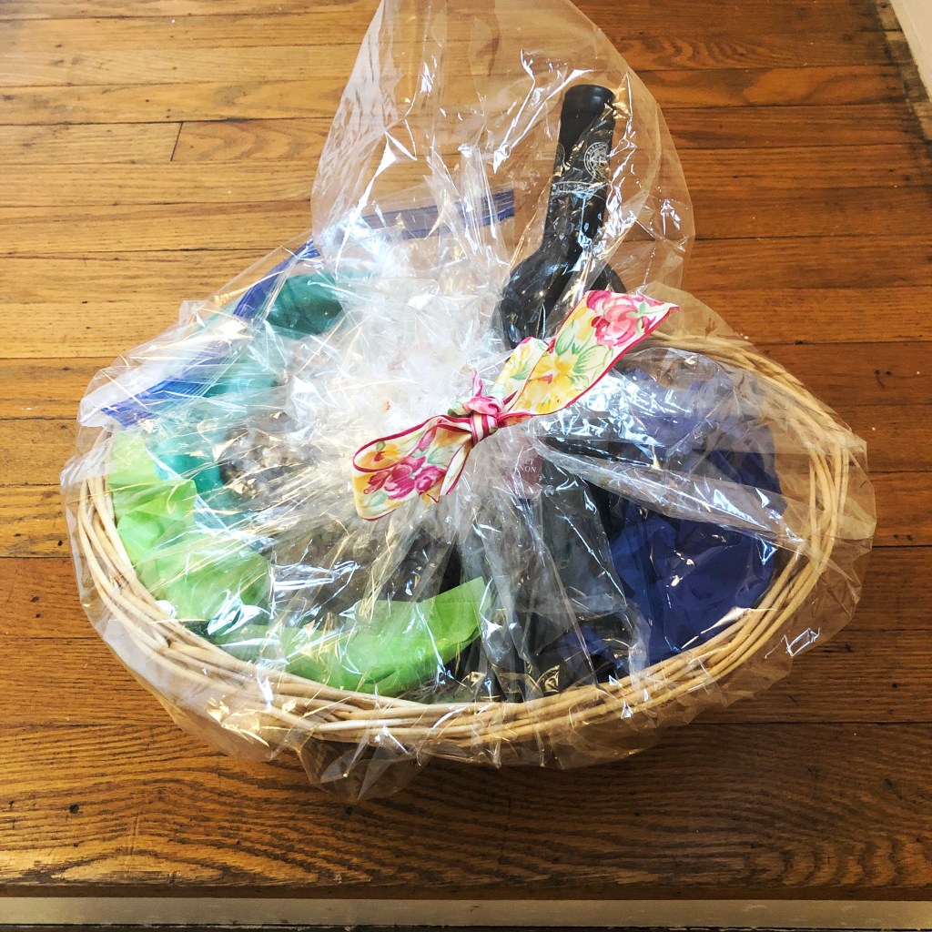 Chanukah wasn’t all shopping; I wrapped two gift baskets for my son’s rebbe and his teacher using only materials in my stash of wrapping materials. Both baskets came to me with gifts for me, and it was such a pleasure to be able to fill them with a bottle of Israeli wine and a batch of homemade cookies. I had one silver basket, which I wrapped in grey tulle I had left over from a tablescape at my youngest daughter’s bat mitzvah and a piece of ribbon saved from a gift that was sent to us. After I finished, I realized it would have been prettier if I had wrapped the cookies in cellophane instead of putting them in a ziploc bag, with its blue sealing strip. I made a mental note to do that in the future, but this way they’ll stay fresh for the recipients.