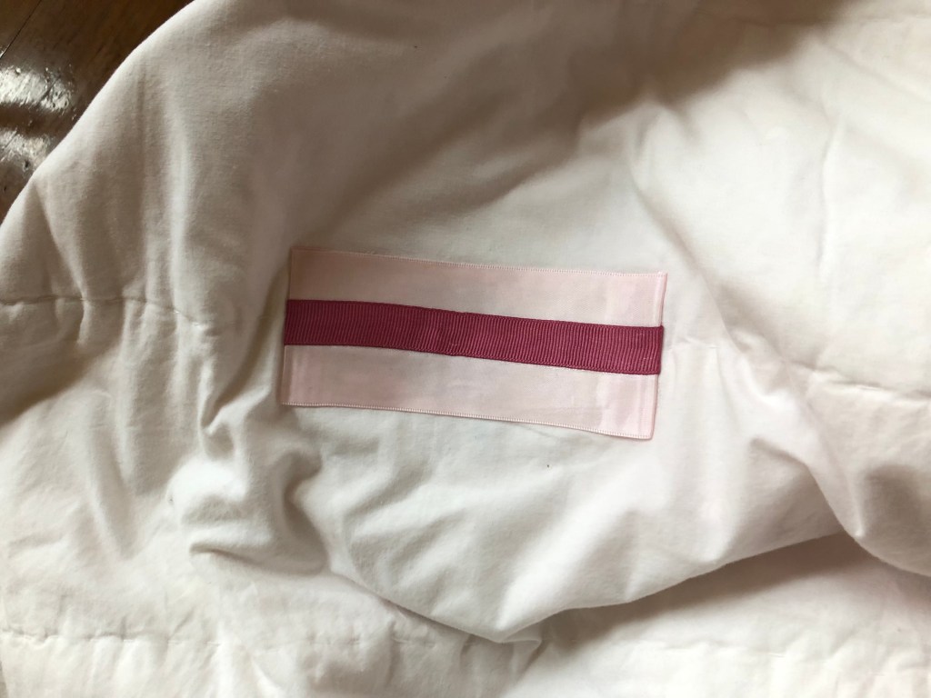 I realized covering the stain was going to be the way to go, and over the course of a year, I must have investigated 10 different options. The problem was, that the colors in the quilt were so light and muted, that any fabric that would blend or accent it was also too light not to show the blue ink through it. As clothing or other items would enter the “upgrade-downgrade cycle,” I held them up against the stains on the quilt but was disappointed every time. I looked at patches and appliques at the fabric store and also came up empty-handed.