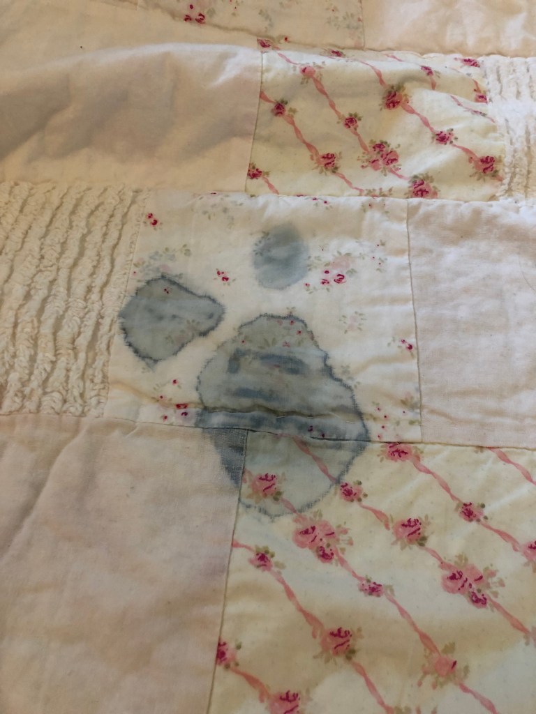 To start, I have to roll the clock back to when my girls (now 17 and 20) were young and shared a room. Their Tante Fé bought them beautiful bedding for their twin-over-full bunk beds. It was all pink and cream and floral, with little hints of sage green. Perfect for two girls sharing a room. Unfortunately, one of those girls left a blue roller ball pen on the bed after doing homework. By the time it was discovered, there were, due to the way cotton fabric draws liquid into itself, two huge blue stains on one of the quilts: one the size of a handprint and the other the size of a silver dollar.