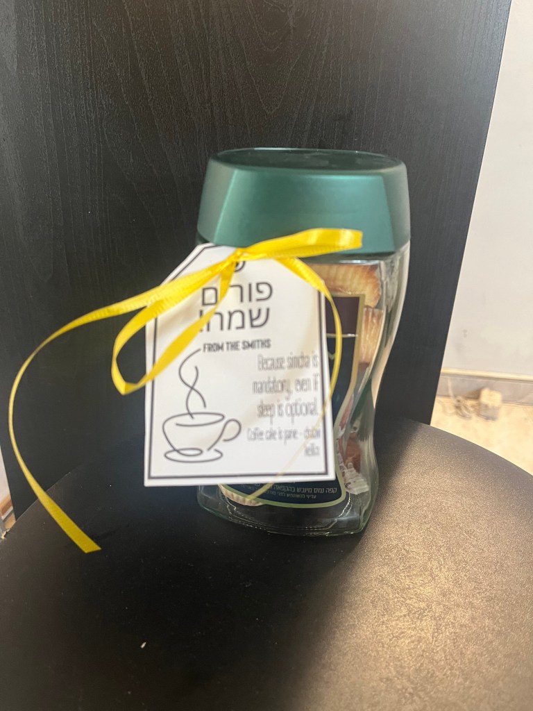We still gave matanot l’evyonim separately through Lma’an Achai, a chessed organization here in Beit Shemesh that we trust and respect, and we still delivered our small handful of coffee-themed mishloach manot on foot. No need for the complicated delivery spreadsheets of years past.